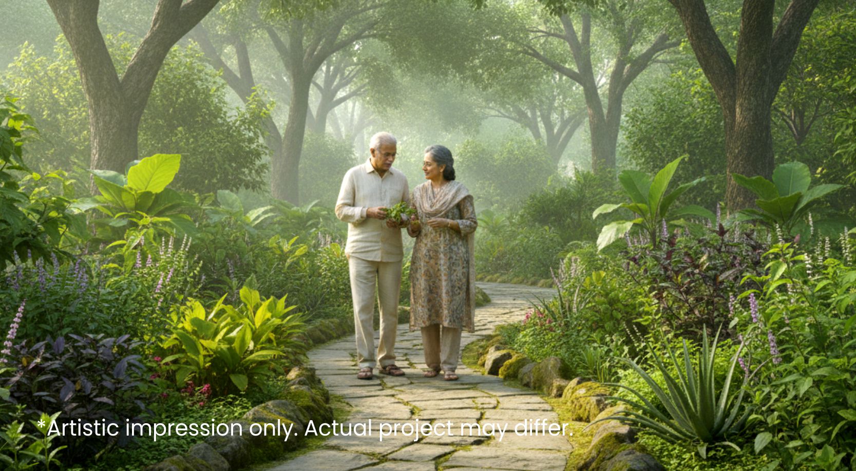 Lush pathways surrounded by medicinal herbs and oxygen-rich plantations. Designed to refresh your lungs, mind, and overall well-being.